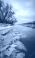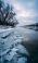 • Frozen river scene with icy shores and stark trees against a dramatic winter sky reflecting calmness and winter's