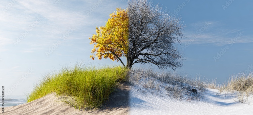Plakat Zima - A tree on a sand dune, split between summer and winter #1608651210