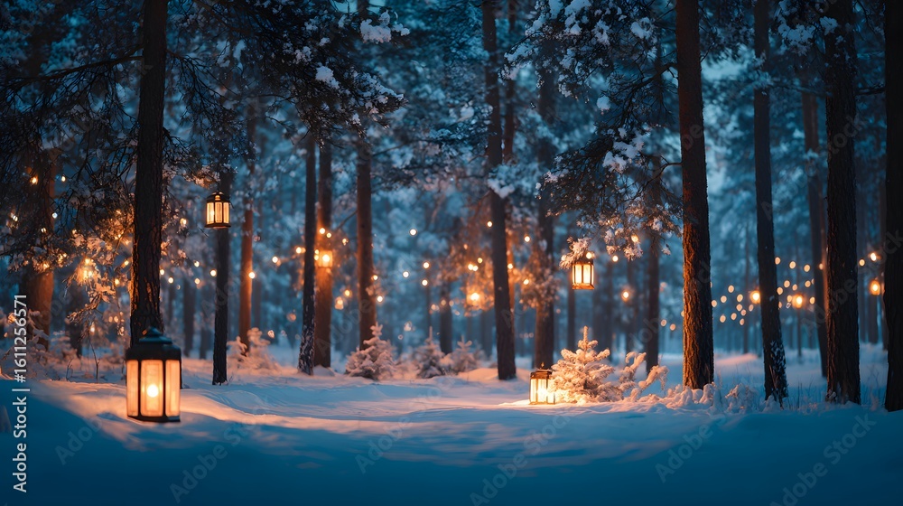 Plakat Zima - Snowy pine forest background during blue hour glowing lantern lights magical winter scenery... #1611256571