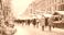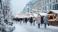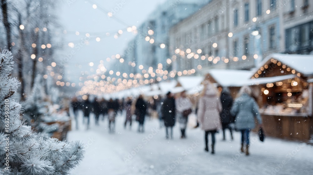 • Bustling winter market scene with snow, lights, and people in warm coats