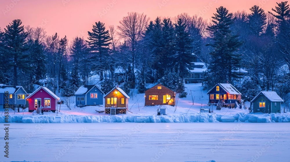 Plakat Zima - Sunset over ice fishing huts in remote winter landscape #1633382545