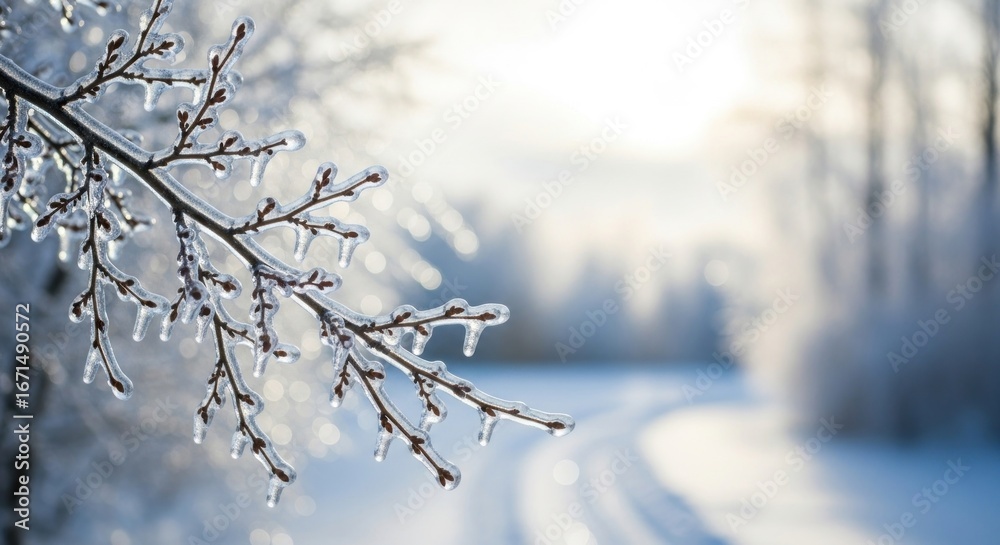 Plakat Zima - Frozen tree branch glistening with ice on a cold winter day in the forest #1671490572