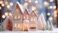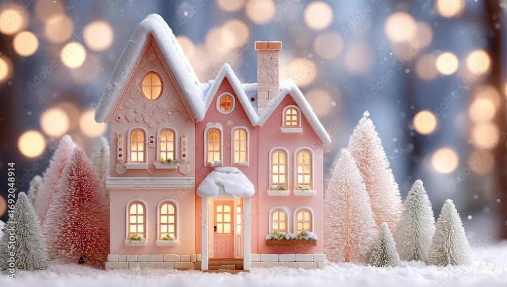 Plakat Zima - Pink snow-covered house miniature, Christmas lights #1692048914