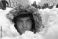 • Young man emerging from snow-covered trench during winter in a city, showcasing resilience and survival efforts