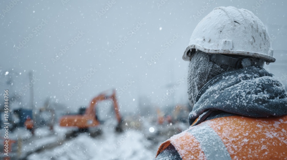 Plakat Zima - Snow covered construction worker in high visibility safety vest looking at job site during winter... #1745986756