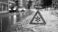 Plakat Zima - Triangular road sign with a snowflake symbol covered in snow, warning of icy and slippery roads,... #1759560664