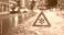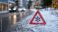 • Triangular road sign with a snowflake symbol covered in snow, warning of icy and slippery roads, representing winter driving safety and hazardous weather conditions