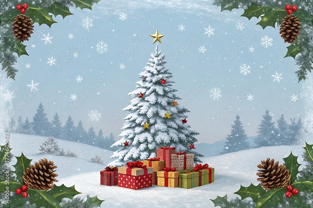 Plakat Zima - Snowy christmas tree surrounded by gifts in a winter wonderland #1774609422