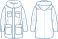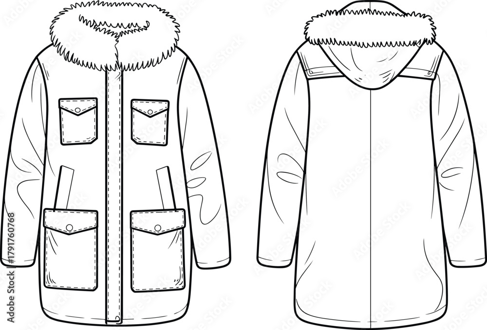 • Hooded Parka Jacket Coat with Fur Trim Technical Fashion Flat Sketch Template CAD Drawing Vector Illustration Garment Apparel Design Mockup