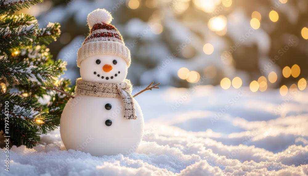• Cheerful snowman in winter wonderland outdoor christmas scene snowy landscape soft natural light warm holiday vibes captured in high resolution photography