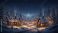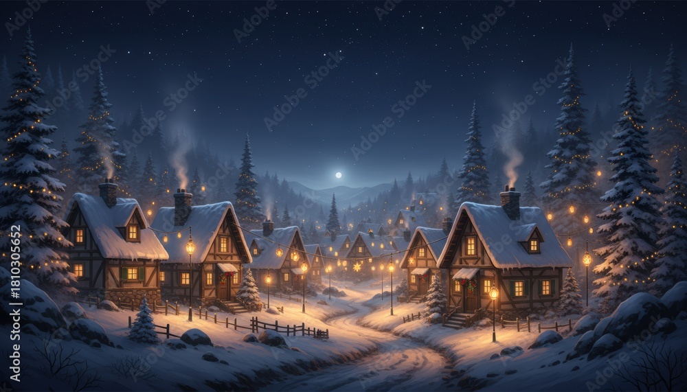 • Snowy village under moonlight with cozy cottages decorated with Christmas lights creating festive winter holiday atmosphere in peaceful mountain landscape