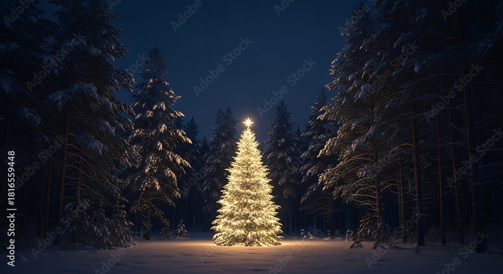 • Illuminated christmas tree in snowy forest at night winter holiday scene