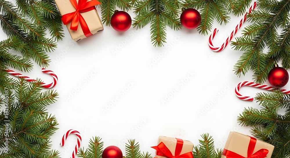 • Festive christmas border with evergreen branches ornaments and candy canes