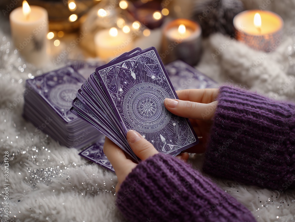 • Woman's hands holding purple tarot cards on fur with candle light and glitter. Concept for divination, magic ritual and mystical predictions