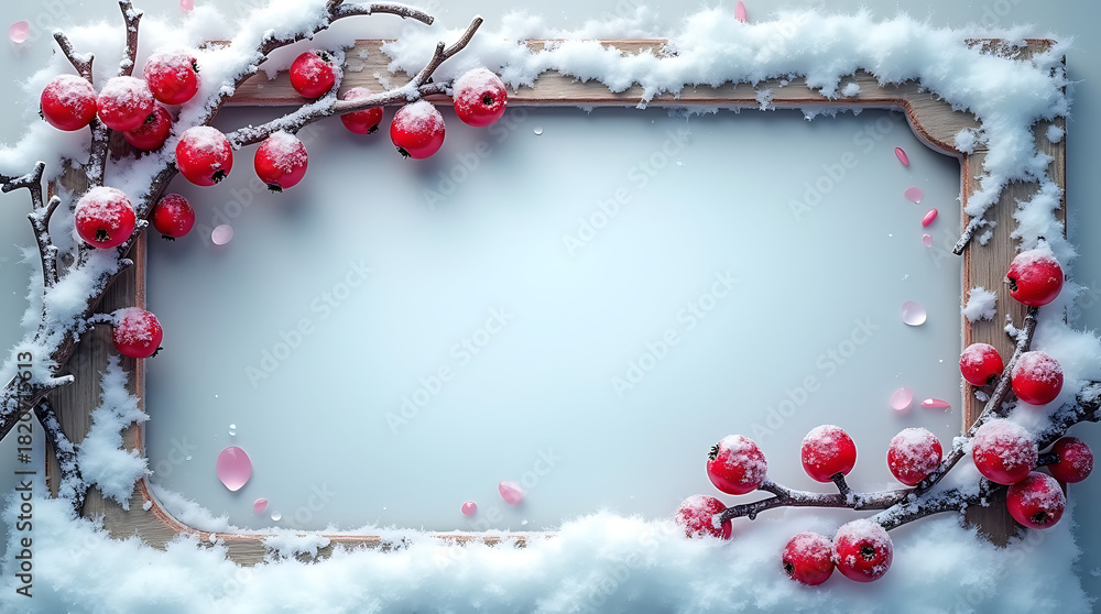 • Winter Frame with Snowy Red Berries and Frosted Branches
