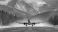 • Passenger plane taking off above a snow-covered runway with engines kicking up snow, framed by snow-capped mountains and pine forests, symbolizing winter travel, aviation, adventure, and exploration