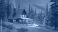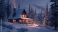 • At dusk, a cozy traditional wooden cabin sits in a tranquil winter pine forest, completely covered in a thick blanket of fresh snow, with a dramatic starry night sky above.