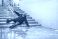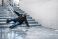 • Horizontal winter accident photo of a man slipping on icy outdoor stairs, frozen surface and gray tones capturing sudden loss of balance, danger, vulnerability, suitable for winter safety awareness