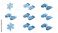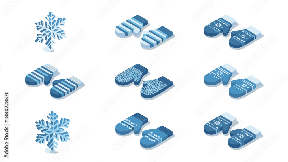 • Isometric winter icons set. Blue knitted mittens. 3D snowflakes collection. Seasonal warm clothing. Frost crystals. Cold weather accessories. Modern geometric vector graphic.