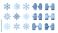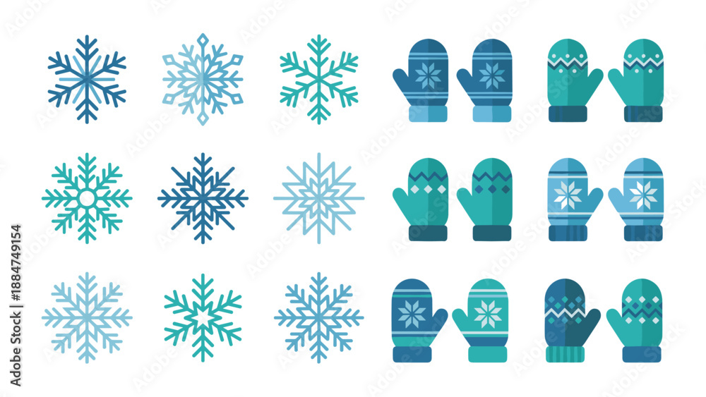 • Winter icon set vector. Snowflake and mitten collection. Flat design symbols. Cold weather season. Christmas holiday decoration. Blue frost crystals. Warm gloves. Snowfall graphic.