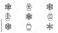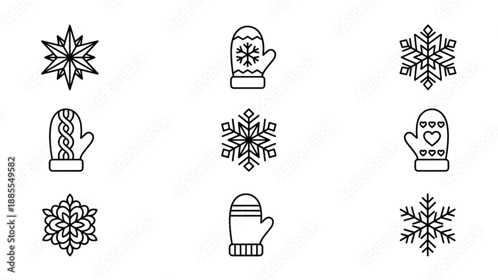 • Set of 9 minimalist winter line art icons featuring unique snowflakes and cozy mittens in a neatly ordered grid; perfect for seasonal holiday designs, weather apps, and winter branding elements.