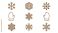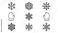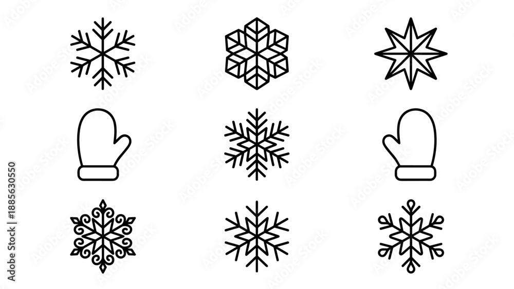 • Set of 9 Minimalist Winter Line Art Icons Featuring Unique Snowflakes and Mittens in a Neat Grid. Clean Black and White Vector Graphic Design for Seasonal Holiday and Cold Weather Projects.