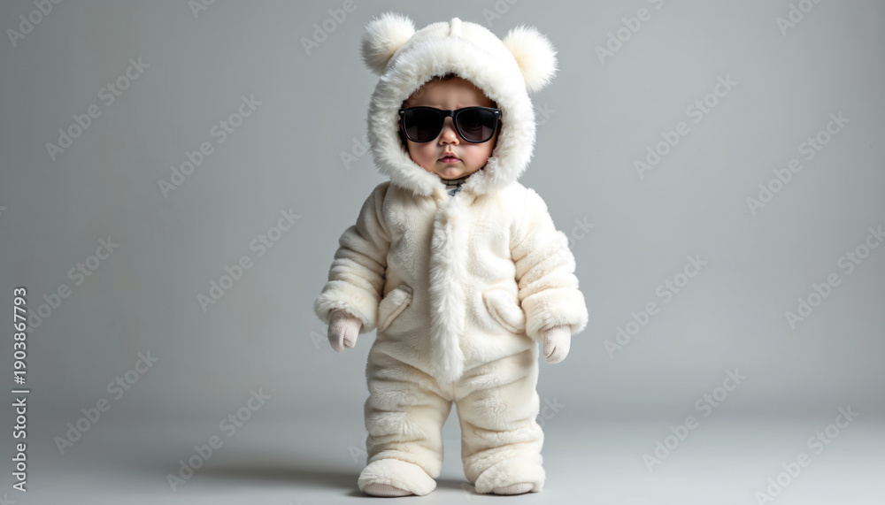 • Cute baby wears a fuzzy white snowsuit and dark sunglasses. This adorable toddler stands confidently, ready for cold weather adventures. Warm winter outfit styled for cool kids.
