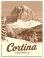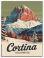 • Vintage travel poster illustration of Ski Cortina Dolomites resort, Italy, winter landscape featuring alpine mountain,s snowy scenery, and classic tourism card design.
