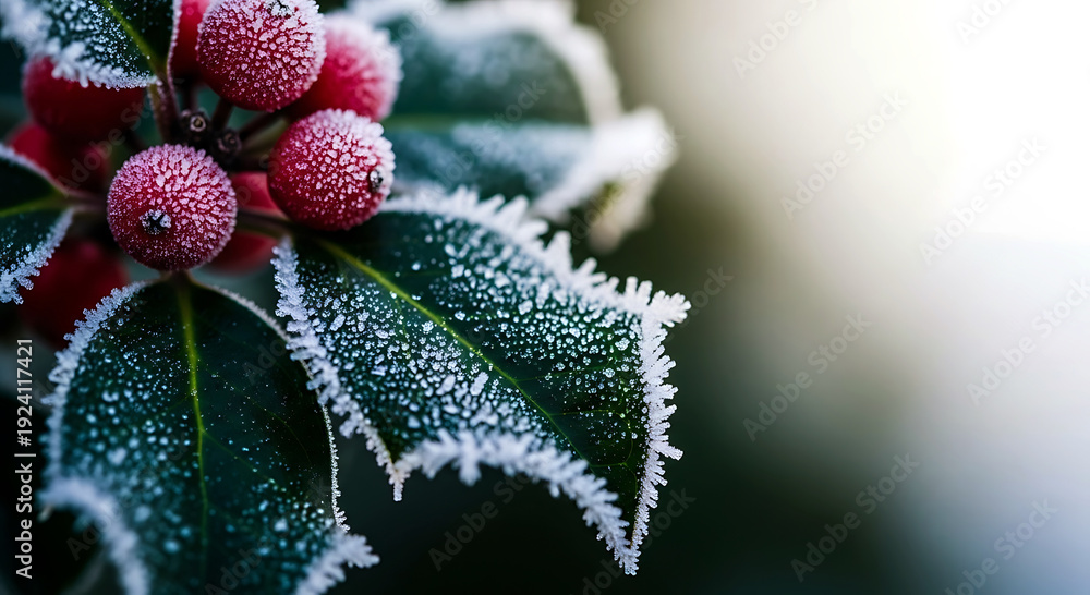 • Frosty Holly Berries in Winter Wonderland with Soft Natural Lighting on Frozen Leaves for Christmas Decor