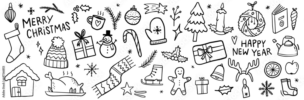 • Merry Xmas and a happy new year doodle set. Cosy December winter collection for the holidays.