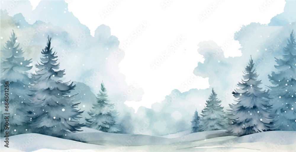 Plakat Zima - Vector watercolor background winter forest trees, snow, for design #684501256
