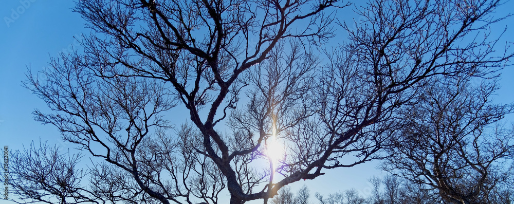 Plakat Zima - Beautiful sunbeams behind leafless tree branches against blue winter sky. #756228041