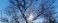 • Beautiful sunbeams behind leafless tree branches against blue winter sky.