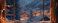 • A cozy mountain village view through a snowy window with warm lights creating a serene and picturesque winter scene
