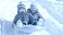 • Sledding down a snowy hill, joyful winter activity, children laughing, soft snow, winter fun