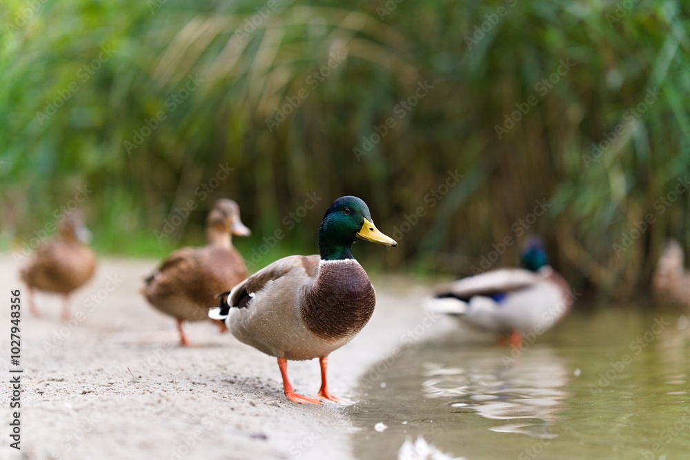 Plakat Zwierzęta - Grupa kaczek krzyżówek przy brzegu stawu #1027948356