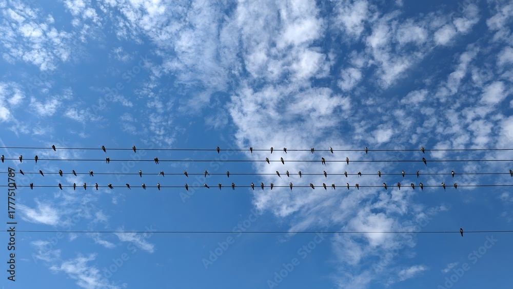 Plakat Zwierzęta - Ptaki na przewodach wysokiego napięcia. Stado ptaków siedzących na liniach energetycznych na tle... #1777510787