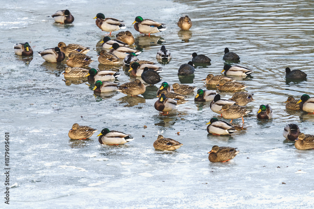 Plakat Zwierzęta - Stado dzikich kaczek krzyżówek stojących na zamarzniętym zbiorniku wodnym zimą. #1879695401