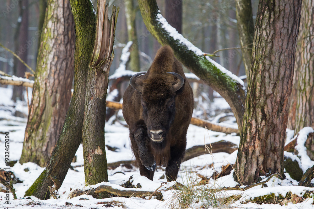 Plakat Zwierzęta - Rodzina żubrów w starym lesie Pszczyny Jankowic Polska #1922457090
