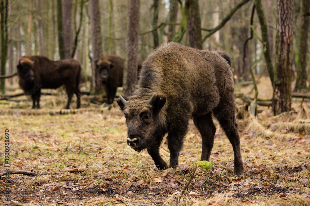 Plakat Zwierzęta - Rodzina żubrów w starym naturalnym lesie pośród powalonych drzew #1930952690