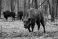 • Rodzina żubrów w starym naturalnym lesie pośród powalonych drzew