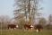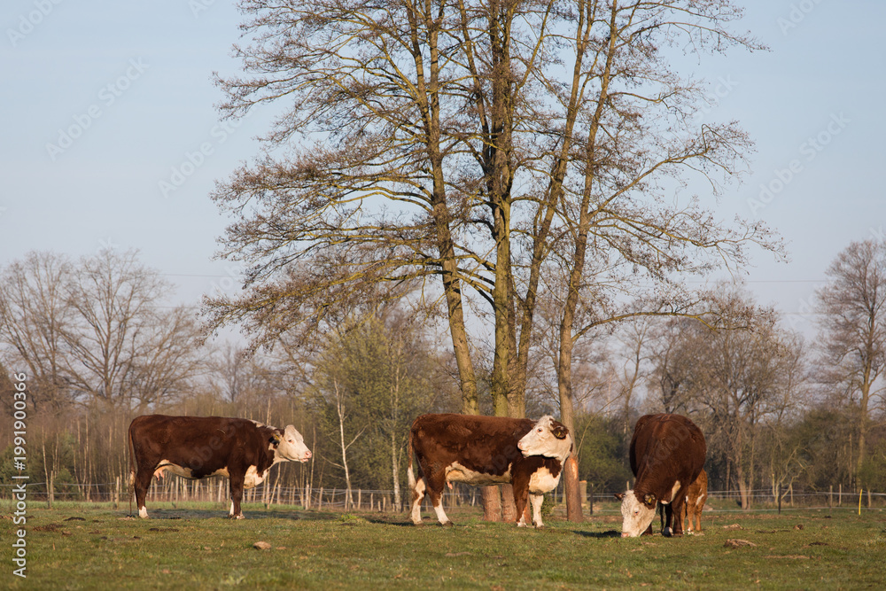 Plakat Zwierzęta - Czerwono białe krowy na porannym pastwisku #1991900366