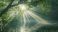 • Promienie słoneczne przebijają się przez gęsty las drzew rosnących nad spokojną wodą, oświetlając malowniczy krajobraz wiosennego poranka.