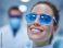• Radosna pacjentka w niebieskich okularach ochronnych i z pięknym uśmiechem na fotelu dentystycznym. W tle rozmyta postać dentysty w masce i okularach.