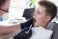 Dentysta w czarnych gumowych rękawiczkach trzyma w dłoni strzykawkę z igłą i robi zastrzyk chłopcu siedzącemu na fotelu dentystycznym z otwartymi ustami.
