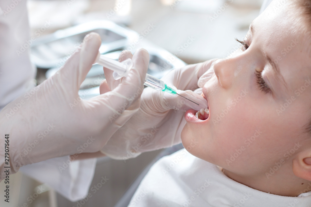 Plakat do Dentysty - Chłopiec w gabinecie stomatologicznym podczas podawania znieczulenia. Dłonie stomatologa w... #279075641