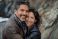 • Portrait of a grinning latino couple in their 40s sporting a classic leather jacket isolated in rocky shoreline background