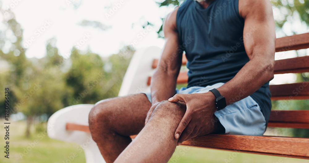 • Knee pain, fitness and hands of person man in park with injury, muscle strain and inflammation on bench. Nature, sports and athlete with accident for exercise, workout or training outdoors for health