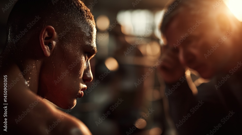 Plakat do Fitness Clubu - Young boxer in gym listening to coach training facility realistic photography athletic... #1450900305