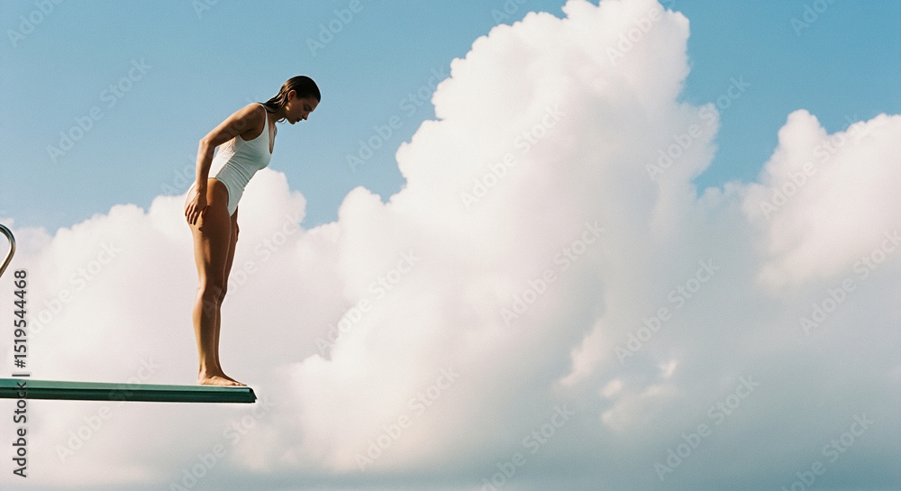 Plakat do Fitness Clubu - Woman in White Swimsuit on Diving Board Against Cloudy Sky #1519544468